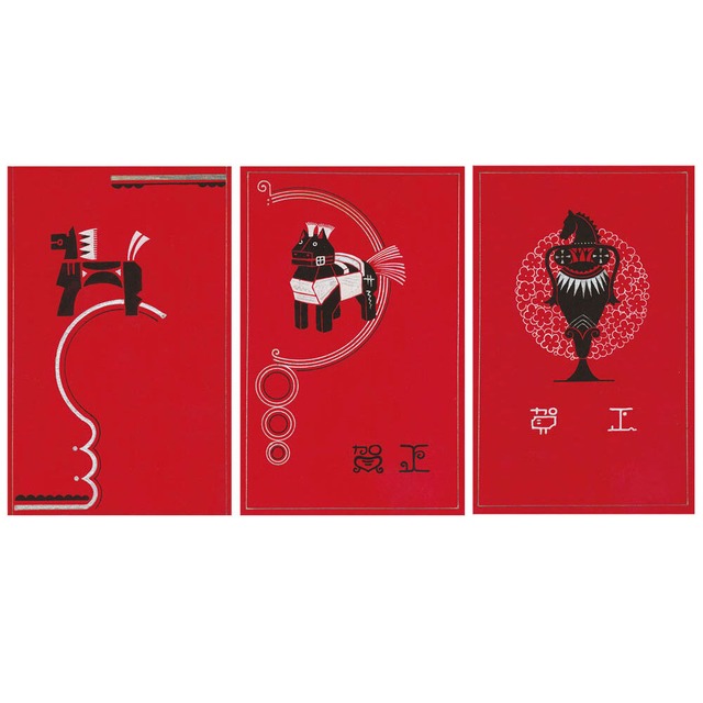 仕様:年賀はがき3柄各1枚 PP入り サイズ:90×140㎜ 高橋春佳が描いた96年前の午年の年賀はがきの中から、特に目を惹く「黒馬と美しい模様」の図案3種類を原画そのままに復刻しています。